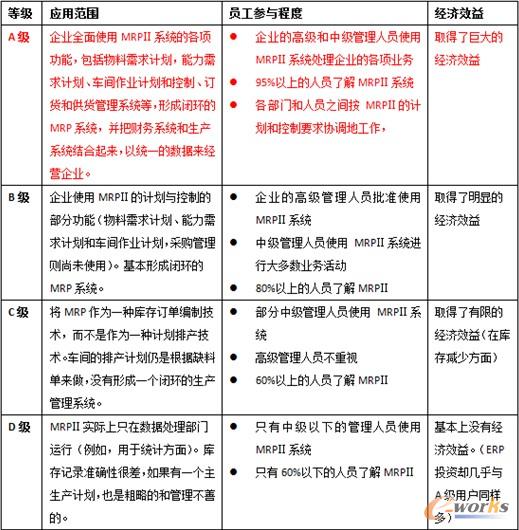 從庫(kù)存總量、庫(kù)存周轉(zhuǎn)率、延期交貨率、采購(gòu)提前期、制造成本、管理人員數(shù)量等方面來(lái)評(píng)估ERP的成效,可分為ABCD四級(jí):