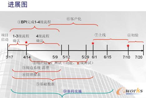 基于管理提升, “建立鋼材為主線的供應(yīng)鏈快速響應(yīng)能力和實現(xiàn)管理精細(xì)化”為目標(biāo)的ERP升級項目,在中集青島冷藏產(chǎn)業(yè)基地經(jīng)過3個半月的緊張推廣實施,于08年7月10日順利實現(xiàn)財務(wù)月結(jié)和財務(wù)報表生成,完成了項目上線。項目進(jìn)展圖如下: