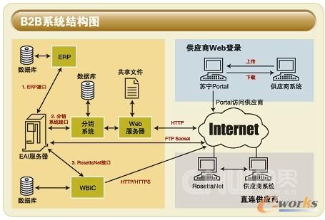ERP不是孤立的系統(tǒng),在成為企業(yè)內(nèi)各種業(yè)務信息和流程的總控平臺后,與外界的接口也成為重要的應用方向。ERP與B2B在蘇寧各有分工; ERP梳理企業(yè)內(nèi)部的管理流程,而B2B則面向上游的供應商; ERP負責將終端數(shù)據(jù)進行收集、整理、加工、系統(tǒng)內(nèi)的傳遞,而B2B平臺則承擔與外部供應商的數(shù)據(jù)交換,商品采購、配送等商業(yè)環(huán)節(jié)。蘇寧電器把ERP作為B2B平臺的后援,進行了功能界定后,逐漸向成熟的供應鏈應用發(fā)展,其與供應商之間的協(xié)同效應將會逐漸顯現(xiàn)。
