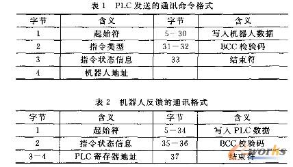 在生產(chǎn)線中PLC與機器人控制器分別編程,PLC與機器人的通訊是整個生產(chǎn)線的核心問題,定義好PLC與機器人的通訊協(xié)議很關(guān)鍵。PLC與機器人之間采用問答式的串口通訊(通訊數(shù)據(jù)的組成由下表1,表2所示)。PLC發(fā)送給機器人的指令內(nèi)容是通知機器人執(zhí)行焊接或者是位姿操作的不同動作,機器人發(fā)送給PLC的指令內(nèi)容則是通知PLC機器人執(zhí)行相關(guān)動作的完成情況。