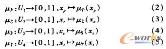 μp、μc、μs和μt分別是模糊集P(流程相對生產(chǎn)能力)、C(流程適應顧客需求)、S(流程適應企業(yè)戰(zhàn)略)、T(流程適應技術水平)的隸屬函數(shù),取值區(qū)間為[0,1]。μp(xp)是U1中元素xp對模糊集P的隸屬度。其余情況一次類推。模糊集P,C,S,T的隸屬函數(shù)和相對隸屬度用Delphi法確定。