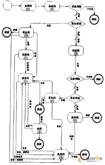 在業(yè)務(wù)流程建模階段,首先要對(duì)業(yè)務(wù)流程作深入的分析,確定組織機(jī)構(gòu)之間及其內(nèi)部的業(yè)務(wù)流程處理工序,確定控制流的走向。同時(shí)要對(duì)各流程進(jìn)行細(xì)化,包含相關(guān)實(shí)體的定義及其上下文的信息,由于各個(gè)流程之間可以互相通信,我們對(duì)業(yè)務(wù)流程進(jìn)行分層次建模。其次,活動(dòng)之間通過信息轉(zhuǎn)移進(jìn)行聯(lián)系,由上層活動(dòng)提供輸入資源,活動(dòng)根據(jù)相應(yīng)的要求進(jìn)行處理,完成其功能。處理完畢后,將所請(qǐng)求的信息提供給相應(yīng)的活動(dòng)。以圖2中的血庫為例:“成份科”從其上層活動(dòng)“采血科”和“化驗(yàn)科”得到信息并對(duì)其處理,將結(jié)果告知血庫將其檢驗(yàn)結(jié)果通知血庫,血庫根據(jù)要求進(jìn)行相應(yīng)的處理。從一個(gè)活動(dòng)向另一個(gè)活動(dòng)的轉(zhuǎn)移可以是有條件的,也可以是無條件,如:采血科向血庫提交成份血就是無條件的,而進(jìn)入化驗(yàn)科的信息需要是體檢合格人員的信息。