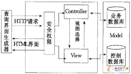 該模型將實(shí)現(xiàn)兩個(gè)功能(圖1所示)。其一,Controller首先通過用戶界面生成請(qǐng)求條件。然后調(diào)用Model中的相應(yīng)業(yè)務(wù)邏輯程序化請(qǐng)求條件,最后View將處理結(jié)果生產(chǎn)HTTP界面返回用戶。其二,是將用戶提交的請(qǐng)求轉(zhuǎn)化為系統(tǒng)識(shí)別的語句,判斷用戶請(qǐng)求是否符合安全權(quán)限,并通過ModeI返回。這樣就實(shí)現(xiàn)了用戶請(qǐng)求過程和數(shù)據(jù)庫分離,因此對(duì)于企業(yè)級(jí)應(yīng)用是一種有效的解決方案。