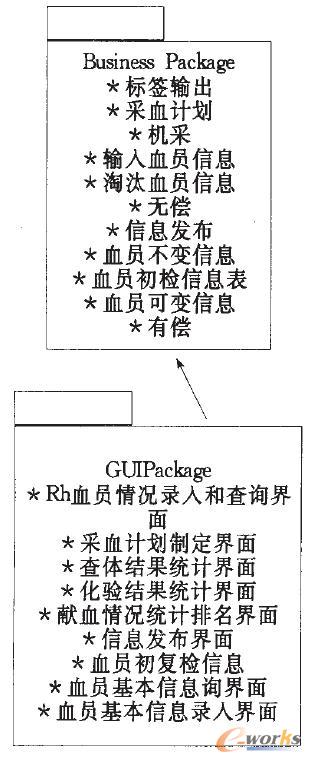 子系統(tǒng)設(shè)計(jì)模型以圖4血源科子系統(tǒng)為例,血源科子系統(tǒng)也分為兩個(gè)包(Package):界面包(GUI Package)和事務(wù)包(Business Package)。界面包包含的事務(wù)對(duì)象有血員不變信息、血員可變信息、標(biāo)簽輸出、輸入血員信息、淘汰血員信息,界面包含血員基本信息錄入界面、血員基本信息查詢界面、查體結(jié)果統(tǒng)計(jì)界面、化驗(yàn)結(jié)果統(tǒng)計(jì)界面、Rh血員情況錄入和查詢界面、采血計(jì)劃制定界面、獻(xiàn)血情況統(tǒng)計(jì)排名界面、信息發(fā)布界面等。