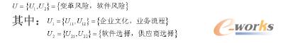 在建立評價指標體系之后,要評估系統(tǒng)實施的風險,可以采用模糊綜合評價方法。模糊綜合評價的一般步驟是:(1)根據(jù)評價目的確定評價指標集合U ={U1 ,U2,Um};(2)給出評價等級集合V={V1,V2,Vn} ;(3)確定各評價指標的權(quán)重W = {w1,w2,wm};(4)確定評價矩陣R;(5)進行綜合評價。例如,欲評估實施 ERP項目的決策風險,由表1知,決策風險包含變革風險和軟件風險兩個風險項,每個風險項還含有二級風險評價指標,于是得到?jīng)Q策風險評判因素集為: