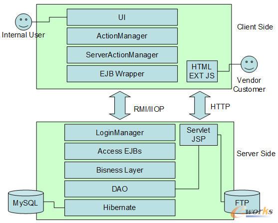 服務(wù)器側(cè)主要負(fù)責(zé)API提供、業(yè)務(wù)處理、數(shù)據(jù)處理等。通過(guò)LoginManager EJB對(duì)外提供GUI客戶端接入,并將請(qǐng)求轉(zhuǎn)發(fā)其他具體模塊的EJB處理。模塊EJB將請(qǐng)求轉(zhuǎn)到業(yè)務(wù)層進(jìn)行數(shù)據(jù)校驗(yàn)、相關(guān)動(dòng)作處理,最后交給DAO層進(jìn)行數(shù)據(jù)處理。DAO最后通過(guò)Hibernate層對(duì)數(shù)據(jù)庫(kù)進(jìn)行數(shù)據(jù)的操作,包括數(shù)據(jù)的增刪改查等。除數(shù)據(jù)庫(kù)外,系統(tǒng)一些文檔等數(shù)據(jù)存儲(chǔ)在另外的FTP服務(wù)器上。這部分的處理一般在Servlet中進(jìn)行,客戶端通過(guò)Servlet上傳文檔,并轉(zhuǎn)發(fā)到FTP服務(wù)器中。