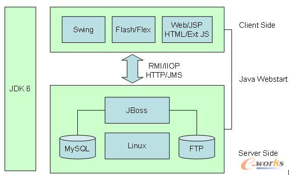 GUI:使用Swing開(kāi)發(fā)圖形界面,使用自行開(kāi)發(fā)的通用圖形組件庫(kù)。同時(shí),一些Web模塊則使用靜態(tài)頁(yè)面HTML、JSP、Ext js、Flash/Flex(如供應(yīng)商在線模塊等);