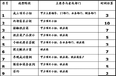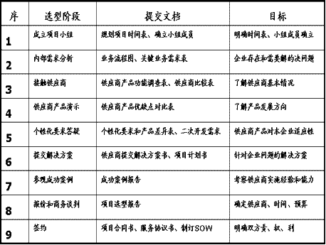 雖然,每個(gè)企業(yè)的情況不同,但是作為企業(yè)應(yīng)用軟件選型還是有規(guī)律可尋,各家企業(yè)在上述選型流程中根據(jù)自己的特性做調(diào)整或增加項(xiàng)目。下表給出了每個(gè)選型流程中需要進(jìn)行的一些工作內(nèi)容。
