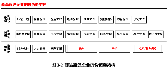 用友ERP-U8的應(yīng)用設(shè)計基于優(yōu)化后的企業(yè)價值鏈結(jié)構(gòu), 將工業(yè)企業(yè)和商品流通企業(yè)的價值鏈結(jié)構(gòu),系統(tǒng)地創(chuàng)新性地組織優(yōu)化之后,如圖(1-1)和(1-2)所示。