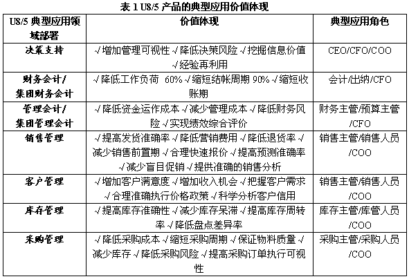 用友ERP-U8產(chǎn)品,全面支持離散制造、流程制造、商品流通、服務(wù)業(yè)、行政事業(yè)、國防航空等行業(yè)企業(yè)的經(jīng)營管理運作和戰(zhàn)略決策支持。產(chǎn)品典型功能領(lǐng)域的價值體現(xiàn),如表(1)所示。