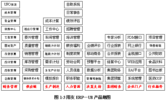 用友ERP-U8適應(yīng)的行業(yè)類型主要包括:制造生產(chǎn)、商品流通、服務(wù)行業(yè)、集團型企業(yè)、行政事業(yè)及國防航空等,其軟件產(chǎn)品地圖,如圖(1-3)所示。