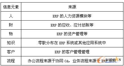 我們從信息元素矩陣的角度出發(fā),如表2所示,可以看出信息元素(人、財、物、知識、客戶、流程)也可以來自以ERP為主的系統(tǒng)中。