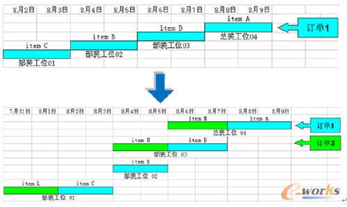 “有限能力”體現(xiàn)在工位上設(shè)備和人員的數(shù)量,換個(gè)角度來說,即此工位同時(shí)可裝配任務(wù)的數(shù)量。下圖所示工位01的能力不能同時(shí)滿足訂單1與訂單2在8月2日到3日兩天的時(shí)間段內(nèi)的生產(chǎn)負(fù)荷,所以,在編制生產(chǎn)計(jì)劃時(shí),自動(dòng)將訂單2在部裝工位01的生產(chǎn)計(jì)劃向前推移2天,移至該工位的空閑時(shí)間段。