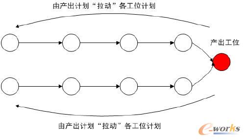 在實(shí)際生產(chǎn)過程中,如果某個(gè)工位出現(xiàn)了“異常”情況,如:物料供應(yīng)不及時(shí)、機(jī)器故障、人為拖期等,導(dǎo)致該工位生產(chǎn)計(jì)劃進(jìn)行了調(diào)整,那么,整個(gè)單件產(chǎn)品在下游各個(gè)工位的生產(chǎn)計(jì)劃也會(huì)相應(yīng)的進(jìn)行推動(dòng)式調(diào)整。如圖4所示。