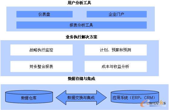 從企業(yè)預算實際考慮,標準的預算管理系統(tǒng)的整體架構由三部分組成:最底層的是數(shù)據(jù)層,由數(shù)據(jù)倉庫與應用系統(tǒng)組成,通過數(shù)據(jù)交換與集成,為業(yè)務執(zhí)行解決方案與用戶分析工具提供基礎數(shù)據(jù),業(yè)務執(zhí)行解決方案包括戰(zhàn)略執(zhí)行監(jiān)控、計劃、預算和預測、財務整合報表、成本與收益分析這幾個方面,通過業(yè)務執(zhí)行解決方案完成預算相關的主要工作,通過用戶分析工具將分析數(shù)據(jù)展示給最終用戶。具體如下圖所示: