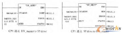 在STEP7用戶程序中,兩個專用的FC塊可用于數(shù)據(jù)交換:DP-SEND:將CPU中的指定的DP數(shù)據(jù)區(qū)的數(shù)據(jù)發(fā)送到Profibus-CP的緩沖器,以便傳送給DP從站。DP-RECV:從DP從站中讀取數(shù)據(jù),將Profibus-CP接收緩沖區(qū)的數(shù)據(jù)放入CPU指定的DP數(shù)據(jù)區(qū)中。