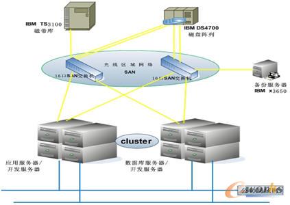 備份環(huán)境通過兩臺(tái)互為熱備的光纖交換機(jī)連接為一個(gè)整體,實(shí)現(xiàn)光纖存儲(chǔ),提高了存儲(chǔ)的效率和性能,避免了對(duì)應(yīng)用系統(tǒng)網(wǎng)絡(luò)資源的占用和消耗。