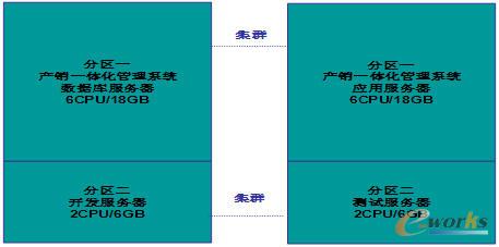 產(chǎn)銷管理系統(tǒng)主服務(wù)器采用兩臺(tái)高端UNIXT服務(wù)器——IBM P570,每臺(tái)服務(wù)器配置8路CPU,24GB內(nèi)存,同時(shí)引入分區(qū)(Partition)技術(shù),使用過程中可根據(jù)自身的業(yè)務(wù)需求,靈活多樣的規(guī)劃系統(tǒng)架構(gòu)。服務(wù)器劃分為兩個(gè)分區(qū),分別作為產(chǎn)銷一體化系統(tǒng)數(shù)據(jù)庫服務(wù)器、產(chǎn)銷一體化系統(tǒng)應(yīng)用服務(wù)器、開發(fā)服務(wù)器、測試服務(wù)器。兩個(gè)分區(qū)之間均采集群技術(shù),互為熱備份。主服務(wù)器分區(qū)示意圖如下:
