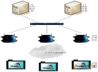 選用2.4GHz無線擴(kuò)頻基站,采用符合IEEE 802.11b標(biāo)準(zhǔn)的直序擴(kuò)頻技術(shù),在行車工作區(qū)域內(nèi)提供無線信號(hào)全面覆蓋,并為移動(dòng)車載終端提供有線接入,使車載終端能直接訪問應(yīng)用服務(wù)器。