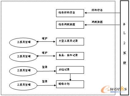 工器具管理負(fù)責(zé)記錄機(jī)組設(shè)備(在線設(shè)備)的故障停機(jī)信息和消耗數(shù)據(jù)、備品備件信息、大型生產(chǎn)工器具信息、點(diǎn)檢記錄、維修計(jì)劃等,以便管理和調(diào)度工器具的檢修、維護(hù)和儲(chǔ)備,其模塊圖如下:
