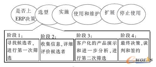 本方法將ERP選型過程分為4個(gè)階段,涵蓋從候選者尋找到合同簽字整個(gè)選型過程。圖2顯示了該方法在ERP整個(gè)生命周期中的角色以及它的4個(gè)階段。