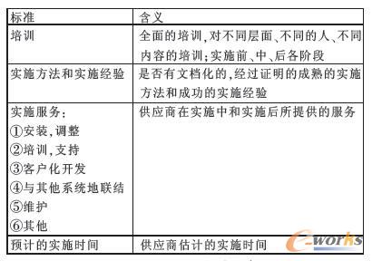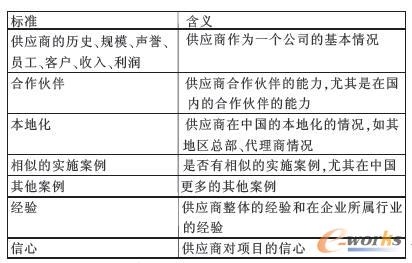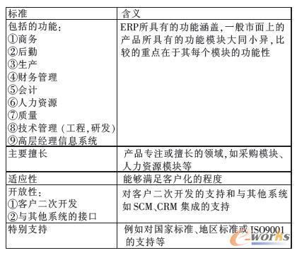 階段2:收集信息,詳細(xì)評(píng)價(jià)候選者。在這一階段項(xiàng)目組需要5~8家候選者的更多更詳細(xì)的信息,可通過一次或者更多的面談、產(chǎn)品演示、以及對(duì)廠商的訪問,甚至是通過其競(jìng)爭(zhēng)者來獲取有關(guān)信息,并使用詳細(xì)的評(píng)價(jià)標(biāo)準(zhǔn)和檢查表對(duì)候選者做出評(píng)價(jià)。本文將給出評(píng)價(jià)標(biāo)準(zhǔn)的框架,需要指出的是,對(duì)每一個(gè)企業(yè),其所應(yīng)用的評(píng)價(jià)標(biāo)準(zhǔn)應(yīng)該是與其特定的需求一致的(如有的企業(yè)關(guān)注生產(chǎn),有的企業(yè)更關(guān)注銷售,有的企業(yè)關(guān)注庫(kù)存和采購(gòu)等),因而,不同企業(yè)的評(píng)價(jià)標(biāo)準(zhǔn)是不同的。此外,在本企業(yè)評(píng)價(jià)標(biāo)準(zhǔn)的建立環(huán)節(jié)上,第三方咨詢機(jī)構(gòu)將扮演重要的角色,因?yàn)閷I(yè)于ERP選型的第三方咨詢機(jī)構(gòu)往往具有完善的評(píng)價(jià)方法論和評(píng)價(jià)標(biāo)準(zhǔn)體系,需要做的只是調(diào)整其評(píng)價(jià)標(biāo)準(zhǔn),以適應(yīng)企業(yè)的特定需要。