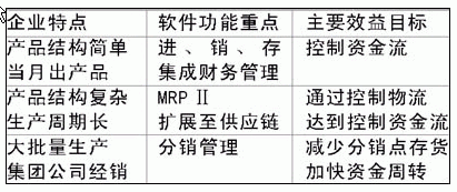 一個(gè)完善的ERP系統(tǒng)是一個(gè)十分龐大的系統(tǒng)。企業(yè)選擇管理軟件不必追究是不是真正的ERP軟件,選軟件也不是按大企業(yè)、小企業(yè)來(lái)區(qū)分,我認(rèn)為要根據(jù)產(chǎn)品特點(diǎn)、生產(chǎn)組織方式、經(jīng)營(yíng)管理方式的不同來(lái)選擇適用的軟件,見(jiàn)表1。