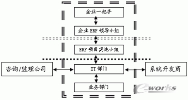 由于ERP系統(tǒng)實施是一個系統(tǒng)工程,需要企業(yè)各方面的全力配合,同時要有充分的組織、人員、經(jīng)費等資源投入。因此在項目實施前應先建立三層架構的組織機構如圖2所示:第一層,建立由高層組成的企業(yè)ERP領導小組,保障項目實施所需資源;第二層,成立以業(yè)務部門主管及骨干組成的ERP項目實施小組;第三層,建立以業(yè)務部門及IT部門為主組成專業(yè)實施小組。同時軟件廠商需要協(xié)助企業(yè)建立項目組織機構,加強項目核心小組成員培訓,使之成為項目實施的、強有力的推動性隊伍。在培訓、流程擬定、數(shù)據(jù)準備、數(shù)據(jù)導入、上線、售后服務等階段通過高效的服務體系給予最及時的服務支持,同時引進項目咨詢監(jiān)理及項目與員工的績效考核掛鉤機制,確保ERP工程項目的成功實現(xiàn)。