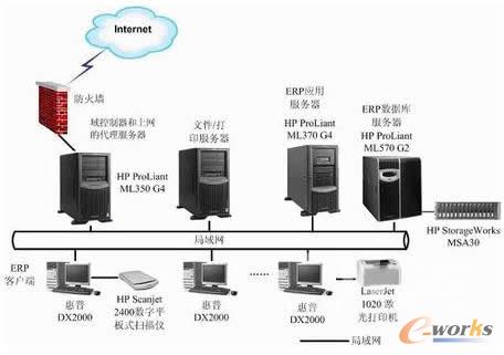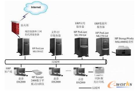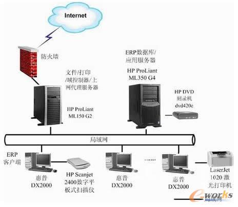 對(duì)于局域網(wǎng)50節(jié)點(diǎn)以內(nèi),并發(fā)應(yīng)用30節(jié)點(diǎn)以內(nèi)的中小企業(yè),由于網(wǎng)絡(luò)規(guī)模不大,局域網(wǎng)數(shù)據(jù)吞吐量較小,在功能服務(wù)器的設(shè)置上采用HP ProLiant ML150 G2作為企業(yè)中心域控制器、內(nèi)部文件服務(wù)器和上網(wǎng)的代理服務(wù)器,在保障企業(yè)通暢連接互聯(lián)網(wǎng)的同時(shí),確保應(yīng)用數(shù)據(jù)的安全,將應(yīng)用服務(wù)器和數(shù)據(jù)庫(kù)服務(wù)器同時(shí)放在一臺(tái)HP ProLiant ML350 G4服務(wù)器上。其他設(shè)備的選型則在保證滿足性能要求的前提下,選擇了性能價(jià)格比很高的惠普系列產(chǎn)品,客戶機(jī)選擇了惠普HP COMPAQ dx2000商用機(jī),A3以下的圖紙通過(guò)HP LaserJet 1020 激光打印機(jī)進(jìn)行輸出,考慮到企業(yè)數(shù)據(jù)量并不大,采用外置的DVD刻錄機(jī)實(shí)行離線備份,利用HP Scanjet 3770 普通商用掃描儀可將部分紙張資料掃描到計(jì)算機(jī)中。