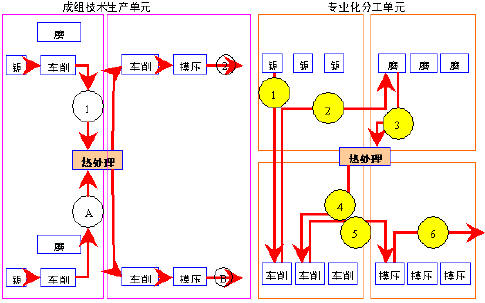成組技術法(group technology):類似的零部件被分成一組,生產(chǎn)這些零部件的工作由一個專門的工作單元負責。與將工作從下一個部門轉(zhuǎn)移到另一個部門交給專業(yè)員工操作不同。如圖2就顯示了兩種布局方式的不同:一種是將生產(chǎn)一種零部件的所有機器組成一個工作中心;另一種是按部門進行布局。成組技術單元減少了不同操作之間的移動、等待時間和在制品庫存,也減少了所需雇員的人數(shù)。體現(xiàn)了日式生產(chǎn)管理方法下消除浪費的指導思想。該方法雖然產(chǎn)生于美國,但其最成功的應用卻在日本。