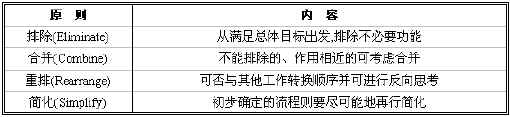 以ERP方案設(shè)計(jì)中業(yè)務(wù)流程圖的設(shè)計(jì)為例。目前流行的確定業(yè)務(wù)流程的有四項(xiàng)原則:排除,合并,重排,簡(jiǎn)化。如表1所示。