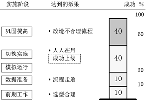 上海三菱電梯公司對ERP的成功有一個非常恰當(dāng)?shù)谋扔鳎哼x對軟件是成功的第一步,走通流程也只是20%的成功,做到人人在用,也就是所說的“上線”只能算成功了60%,只有學(xué)會用系統(tǒng)提供的信息進(jìn)行正確決策,改革不合理流程,見到效應(yīng),才基本算是100%成功。