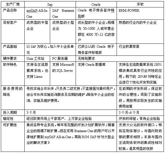 目前國(guó)內(nèi)外各大知名廠商,如SAP、微軟、oracle、金蝶、用友、東軟等,已經(jīng)開(kāi)始關(guān)注中小企業(yè)的ERP市場(chǎng),提出了各種面向中小型企業(yè)的解決方案。表1對(duì)德國(guó)SAP公司推出的mySAPAllInOne和SAPBusinessOne解決方案、美國(guó)Oracle公司的Oracle電子商務(wù)套件特別版、我國(guó)東軟公司的ERMPOWER解決方案作了一個(gè)簡(jiǎn)單的比較。