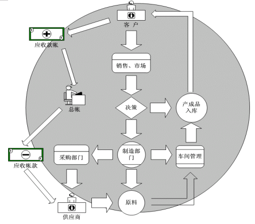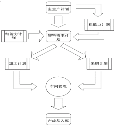 圖1的的流程簡單概述如下:客戶下訂單給企業(yè)的銷售部門,銷售部門與客戶確認定單,定單確定后銷售部門首先查看成品倉庫,如果成品庫中的數(shù)量可以滿足客戶的訂貨需求,就直接發(fā)貨給客戶,行成應收款,銷售過程基本完成。如果成品庫存不能滿足客戶訂單,銷售部門會把訂單下放到生產(chǎn)管理部門,生產(chǎn)管理部門負責做主生產(chǎn)計劃,經(jīng)過粗能力審核,形成MRP,MRP生成采購計劃和自制計劃,采購計劃下放到采購部,采購部選擇合適的供應商,供應商提供原材料進入原材料庫;自制計劃經(jīng)過細能力審核,進入車間任務系統(tǒng),車間任務經(jīng)過合理調(diào)節(jié),進入車間作業(yè)系統(tǒng),車間作業(yè)安排生產(chǎn),進行能力調(diào)整,最后生成成品,經(jīng)過質(zhì)量檢驗,成品入庫。同時,在采購部形成應付款,在銷售部形成應收款,應收與應付自動分錄,進入總帳系統(tǒng)。