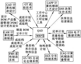 圖1中,標明了主要的相關(guān)信息和數(shù)據(jù)。其中,MRPII同CAD/CAPP/CAM的信息交換最為密切。運行MRP系統(tǒng)最基本的數(shù)據(jù)—BOM(物料清單),主要來自CAD,要從CAD產(chǎn)品數(shù)據(jù)管理系統(tǒng)(PDM)將MRPII所需信息轉(zhuǎn)換過來;設(shè)計變更信息也要從CAD及時輸入MRPII系統(tǒng)。MRPII生成的生產(chǎn)計劃又要提供給CAM或FMS。在新產(chǎn)品較多,工程設(shè)計變化頻繁情況下(如TRANSIT車),為了迅速響應(yīng)不斷變化,眾多的信息和數(shù)據(jù)及時交換尤為重要,也只有把信息和數(shù)據(jù)與其它方面技術(shù)集成在一起,才能增強企業(yè)的競爭力。江鈴QAD系統(tǒng)全面集成了信息和數(shù)據(jù)。
