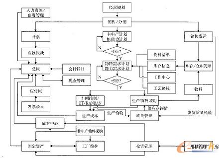 (1)以豐富的功能滿足跨國公司復(fù)雜業(yè)務(wù)的需要。ERP對MRPⅡ原有功能進行了拓寬,增加了質(zhì)量管理、運輸、分銷、倉庫管理、工廠維護、人力資源和薪資管理、項目管理、投資管理等功能子系統(tǒng)。ERP整個系統(tǒng)流程如圖1所示。