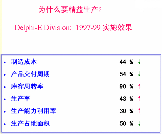 為什么要做精益生產(chǎn)呢?下面是Delphi-E Division在97年-99年進(jìn)行精益生產(chǎn)后的收益。在座的企業(yè)人士肯定會(huì)非常的心動(dòng)。