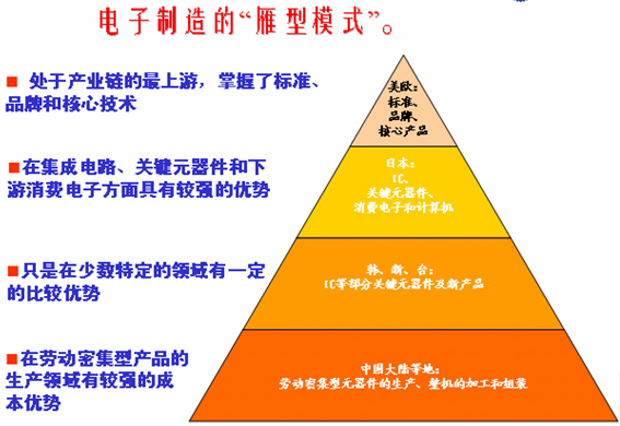 作為電子企業(yè),雁型的模式發(fā)展的更好,像是歐洲式的企業(yè),它是處于產(chǎn)業(yè)鏈的上端,它是處在這個(gè)產(chǎn)業(yè)的上端。它在一些關(guān)鍵的集成電路等等方面也占了非常領(lǐng)先的地位。我們?cè)趤喼奁渌囊恍﹪,它只是在少?shù)的領(lǐng)域有特點(diǎn),比如在臺(tái)灣在器件方面是有優(yōu)勢(shì)的。從我們國家目前來來看,還是體現(xiàn)在勞動(dòng)緊密型方面具有優(yōu)勢(shì)。所以目前我們的重點(diǎn)還是在這些勞動(dòng)密集型方面有優(yōu)勢(shì)。