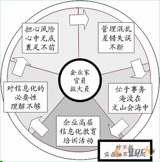 在許多企業(yè)里經(jīng)常有這樣一種"怪圈":企業(yè)管理混亂,管理高層為了處理日常工作中的矛盾和沖突,成天陷在文山會海里,加上外部一些非得親自出面的活動,疲于奔命。上級機關(guān)或培訓(xùn)機構(gòu)舉辦的一些培訓(xùn)班,抽不出身無法參加。由于沒有機會接受信息化培訓(xùn),對信息化的意義和必要性不理解,聽到一些消極負面的傳聞,更是顧慮重重,裹足不前。于是,管理混亂依舊,陷在文件和會議的沼澤中不能自拔。如此周而復(fù)始,始終與信息化管理無緣。見圖。