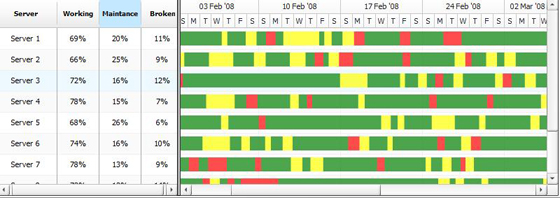 生產管理過程中,要隨時關注車間設備、人員等資源在時間軸上的可用狀態(tài),觀察可用量和占用量的變化,找出超出負荷的點,并予以調整。甘特圖中的資源圖正是用來解決這個問題的良好工具,比如下面這張圖,很直觀地表現(xiàn)出了幾臺設備的正常工作、維護、當機等狀態(tài)。