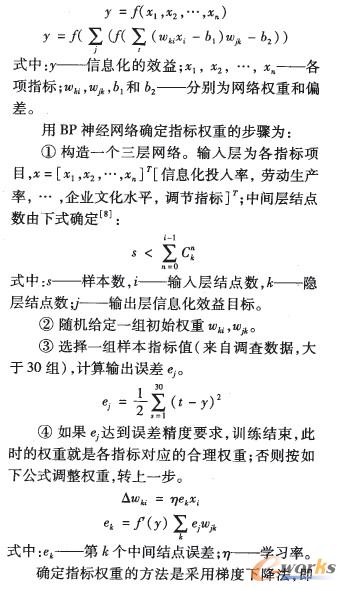 BP神經(jīng)網(wǎng)絡(luò)是人工神經(jīng)網(wǎng)絡(luò)的一種,由于它具有非線性和魯棒性等突出的優(yōu)點(diǎn),具備了比較實(shí)用和有效的訓(xùn)練方法,為此,用它來確定企業(yè)信息化經(jīng)濟(jì)效益評(píng)價(jià)指標(biāo)權(quán)重是可行的。企業(yè)是一個(gè)復(fù)雜的系統(tǒng),把信息化效益作為系統(tǒng)的輸出,則對應(yīng)的輸入是一組指標(biāo)值,即