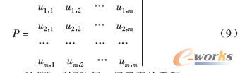 設(shè)選擇的評(píng)估指標(biāo)變量用uj,i來表示uj相對(duì)于ui的相對(duì)重要性(此處i,j均表示指標(biāo)變量,m表示變量個(gè)數(shù),即m=9),可通過同行專家評(píng)議確定。根據(jù)評(píng)議結(jié)果,可得判斷矩陣[P]如下: