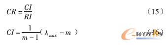 根據(jù)式(12)求出的最大特征根所對(duì)應(yīng)的特征向量{wj}反映了評(píng)估指標(biāo)因素重要性的排序,但作為指標(biāo)相關(guān)權(quán),其權(quán)數(shù)分配是否合理,需要對(duì)判斷矩陣進(jìn)行一致性檢驗(yàn),計(jì)算其隨機(jī)一致性比率CR來進(jìn)行判斷。