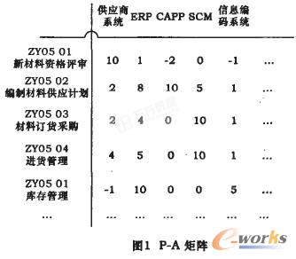 P一A矩陣即業(yè)務(wù)過程與信息系統(tǒng)的關(guān)聯(lián)矩陣,如圖1所示。在P一A矩陣中,行代表各業(yè)務(wù)過程,列代表各信息系統(tǒng)。行列交叉處填寫信息系統(tǒng)對(duì)業(yè)務(wù)過程運(yùn)行狀況的促進(jìn)作用,評(píng)分范圍從一10一10分。下面介紹具體的評(píng)分標(biāo)準(zhǔn):
