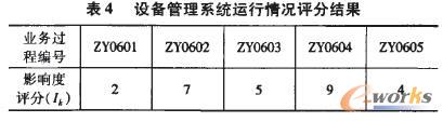 根據(jù)企業(yè)內(nèi)具有豐富經(jīng)驗(yàn)的從設(shè)備采購、設(shè)備認(rèn)證、設(shè)備維護(hù)、設(shè)備財(cái)務(wù)統(tǒng)計(jì)等與設(shè)備管理相關(guān)人員對(duì)設(shè)備管理系統(tǒng)在半年之內(nèi)的運(yùn)行情況進(jìn)行客觀估計(jì)打分,從而得出該系統(tǒng)對(duì)各業(yè)務(wù)過程影響的量化值,如表4所示。