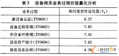 為了便于設(shè)備的信息化管理,某企業(yè)設(shè)備管理部門新投人運(yùn)行了設(shè)備管理信息系統(tǒng)。采用基于CSF的業(yè)務(wù)過程價(jià)值的模糊綜合評(píng)價(jià)法得出與設(shè)備有關(guān)的業(yè)務(wù)過程及其價(jià)值量化值如表3所示。