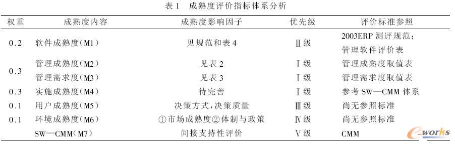 實施成熟度是復合成熟度,其它成熟度會給實施成熟度帶來影響,給實施成熟度造成影響的程度依次是管理成熟度、管理需求度、軟件成熟度、用戶成熟度和環(huán)境成熟度。目前僅完成了服務能力測評,包括服務商的知名度、實力、成功案例、服務質量響應、顧問水平影響力、實施資料齊全、市場份額、持續(xù)發(fā)展、對軟件的理解、客戶口碑、IT 規(guī)劃能力、供方的市場定位與本企業(yè)的符合程度、行業(yè)經驗。需要全面的構建與設計指標。