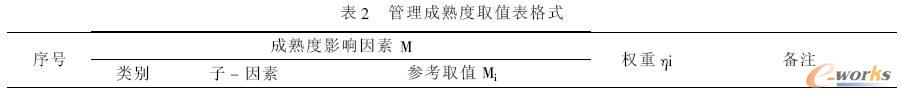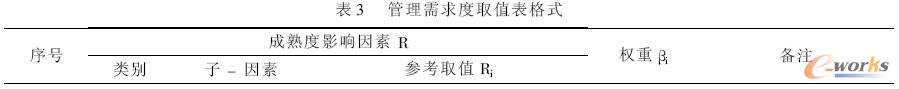 管理成熟度衡量企業(yè)是否具備實施ERP 的基本條件以及達到的程度,反映企業(yè)應用ERP的可行性,用來支持可行性研究;管理需求度能反映企業(yè)應用ERP 的需求程度和原動力。只有同時有需求也有可能的情況下,ERP 的應用才具備了基本的條件。測評指標設計就是在企業(yè)因素系統(tǒng)分析的基礎上,通過對因素分析法和關鍵成功因素法,對影響企業(yè)ERP 應用的基礎因素和影響信息化需求的基礎因素進行科學分析,并設計成定量指標體系,便于測評,管理成熟度、管理需求度可實現(xiàn)度量,其度量取值格式見表2、表3,其計算方法如下。