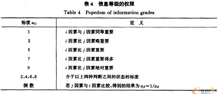 為了量化各因素間的兩兩比較因素,引人1-9標度。根據(jù)心理學家的研究結(jié)果,人們區(qū)分信息等級的權(quán)限能力為7士2,因此采用表4中的1-9標度。