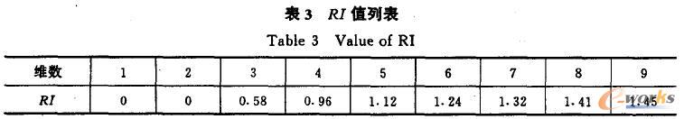 但是,評價因素越多,即判斷矩陣的維數(shù)n越大,判斷的一致性將越差,故應放寬對高維判斷矩陣一致性的要求。